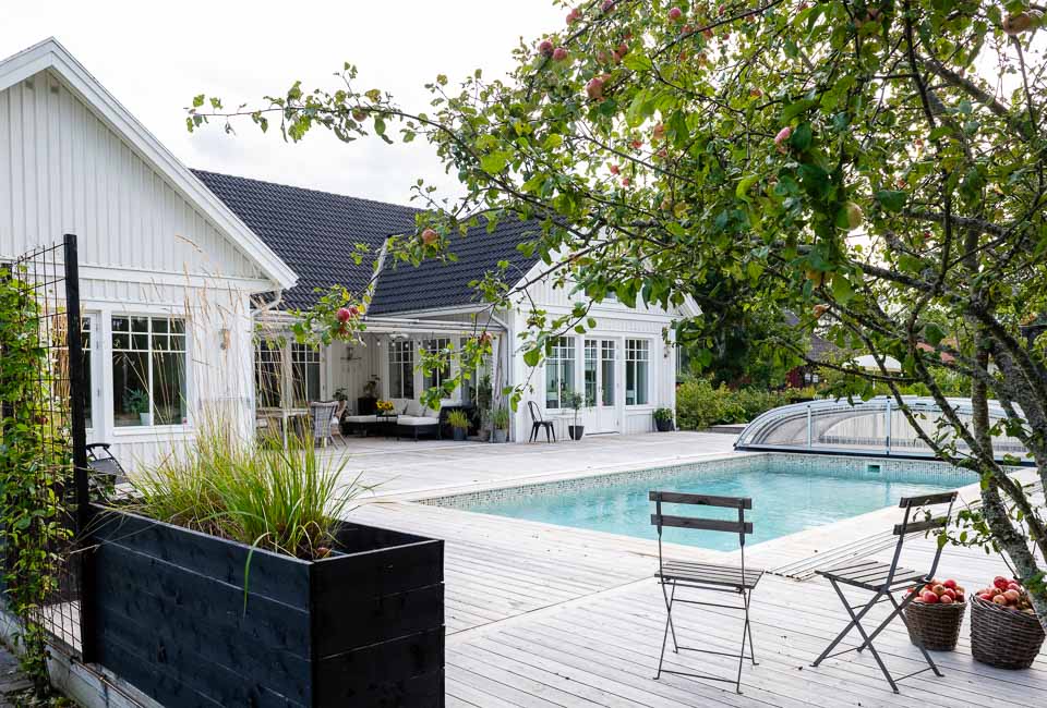 Den U-formade huskroppen skapar en trevlig innergård. Poolen byggdes till senare och då utökades trädäcket runt om.